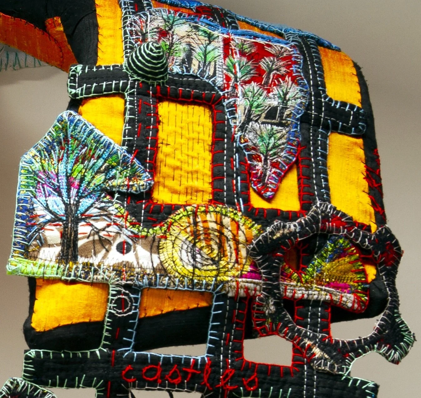 THE MAP; 25”h x 20”w x 14”d; Silk, cotton, paint, felt, recycled plastic rings that are wrapped and embroidered to create bead “donuts”, metal and plastic armature (embedded); Quilted, appliquéd, embroidered, hand and machine stitched, stuffed (with felt scraps) fabric cones, constructed ; THE MAP depicts my childhood home, its environs, and my imaginary kingdom there. - photos: Penina M